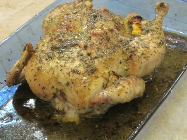 After 30 minutes, spoon some of the liquid in the roasting pan over the chicken.