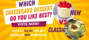 Cheesecake Survey Do you prefer the New Cheesecake Dessert or our Classic or Blueberry? Vote Now and Get 10% OFF Your Favorite One! InstagramThis field is for validation purposes and should be left unchanged.Email* Choose Your Favorite Cheesecake*Choose Your FavoriteNew CheesecakeClassicBlueberry