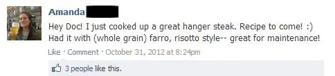 Amanda S. recently wrote, “Hey Doc! I just cooked up a great hanger steak. Recipe to come! π Had it with (whole grain) farro, risotto style — great for maintenance!”
