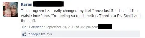 She writes, “This program has really changed my life! I have lost 5 inches off the waist since June. I”m feeling so much better. Thanks to Dr. Schiff and the staff.”