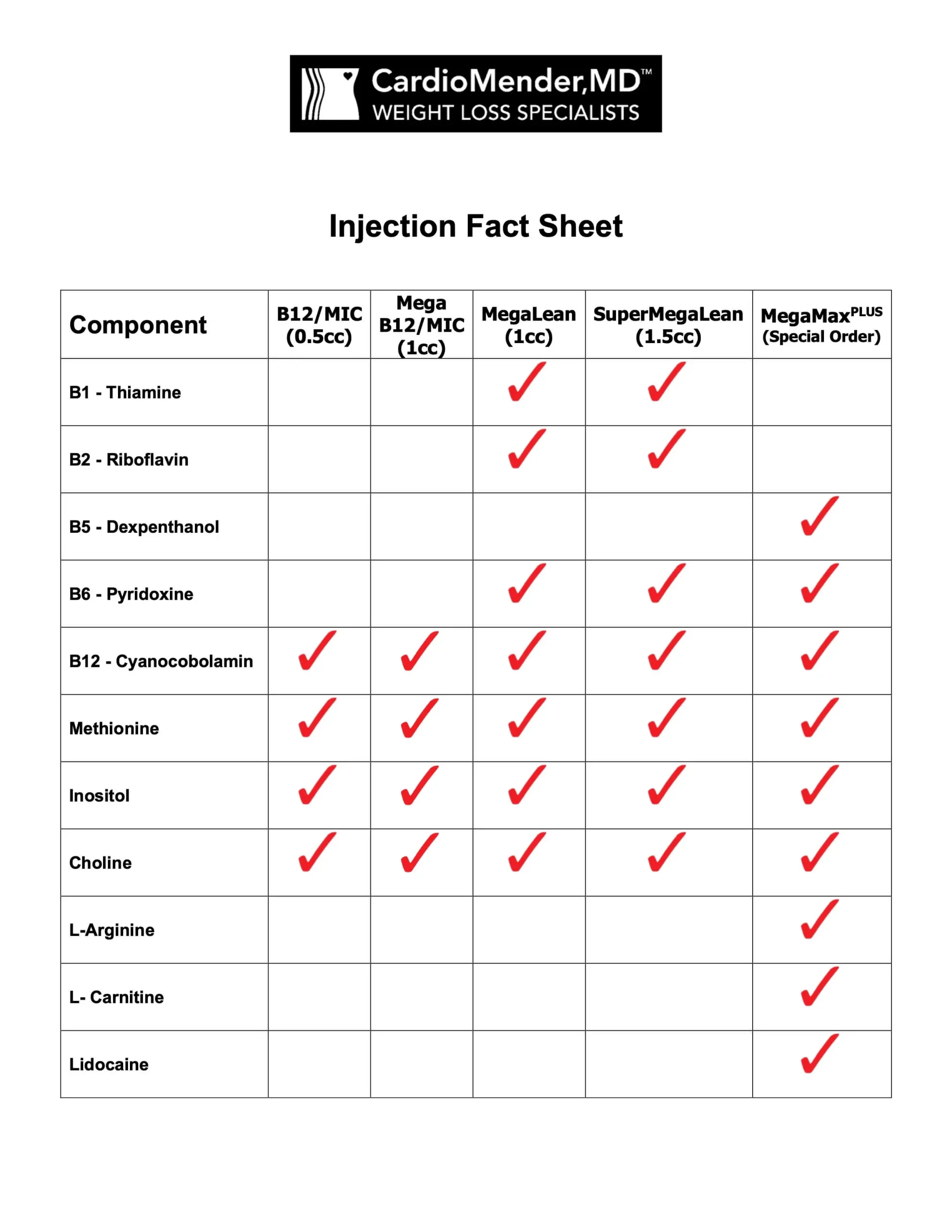 CardioMender, MD’s Mega B6/B12/MIC Lipotropic Injection is specially formulated to meet our highest standards. It is produced in a sterile, compounding pharmacy inspected by the US-FDA. Our Mega B6/B12/MIC lipotropic injection contains 50 mg of B6 and 1000 mcg of Cyanocobalamin (B12) in addition to the lipotropic agent, MIC. It is designed to support optimal energy metabolism, hence fat burning when accompanied by a calorically restricted diet. Each batch undergoes rigorous quality assurance testing to reduce the likelihood of being exposed to impurities and harmful toxins, and to ensure that you are getting exactly what you’re paying for.
